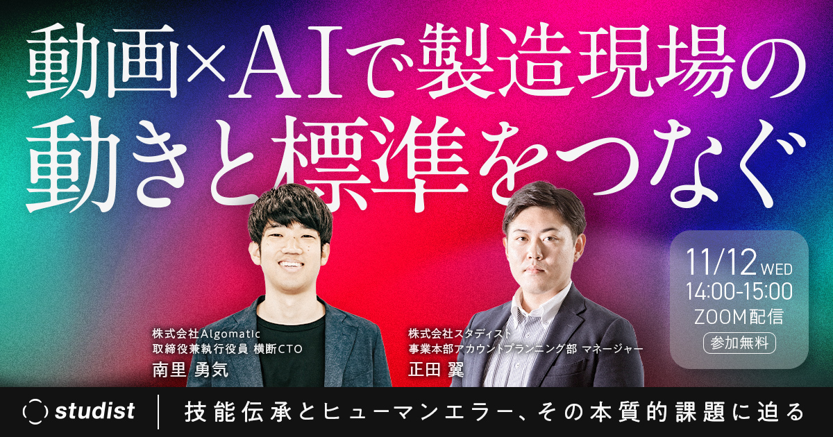 今回は、動画から手順書を整備し教育の仕組み化を支援するスタディストと、リアルタイム動画解析によってヒューマンエラーの予兆を捉えるAlgomaticの2社が、それぞれの視点から現場の課題にアプローチします。