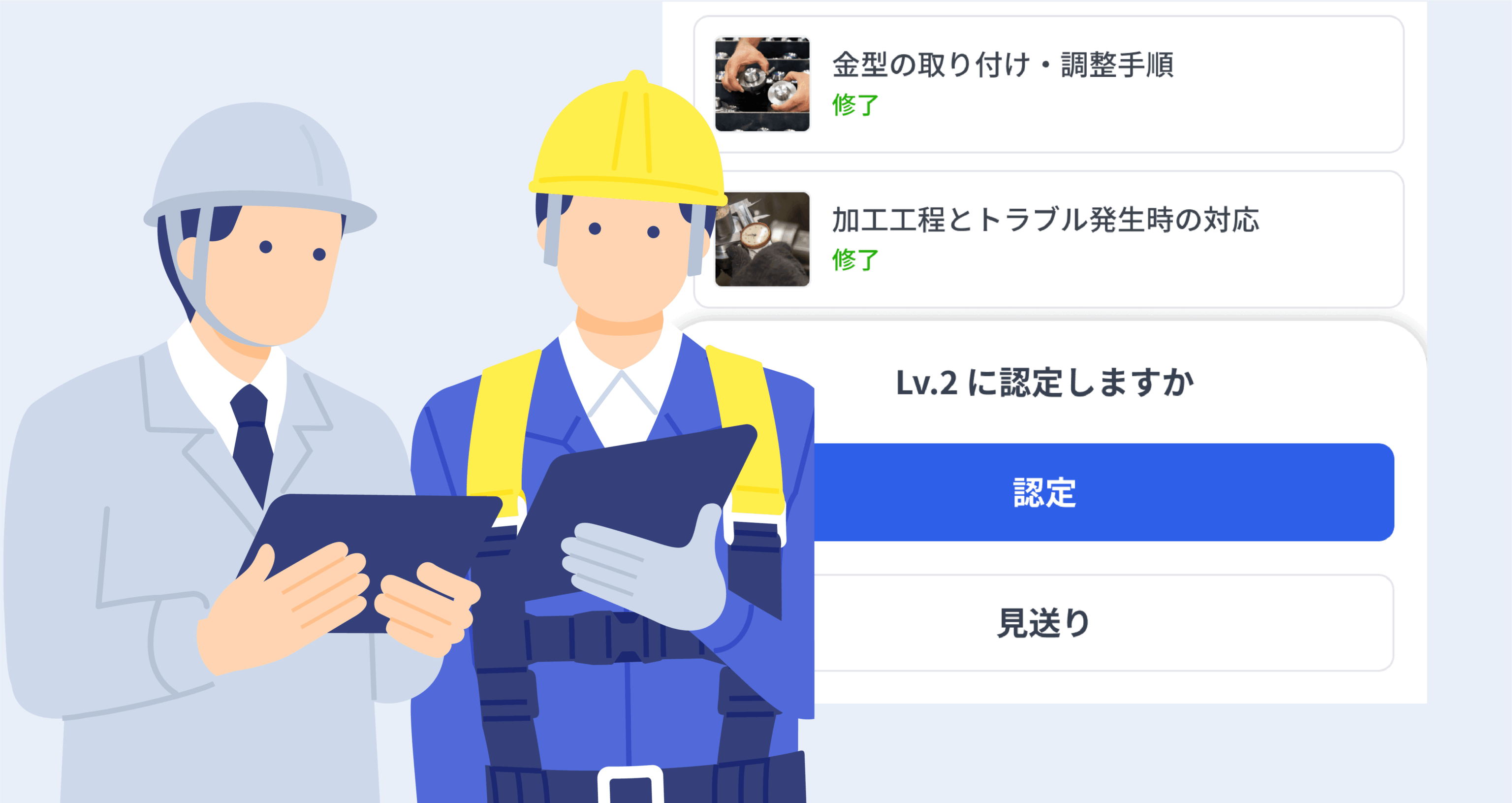 スキル習得判定はLv(レベル)に応じてトレーナーに認定を依頼します。対話を通じてスキルを正しく判定。適切なタイミングでのフィードバックにより納得感を得ることができます。