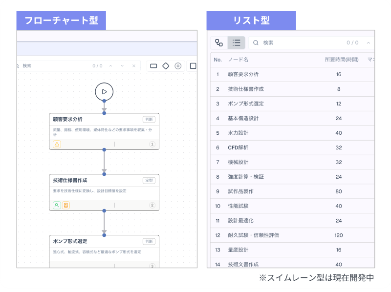 自由に配置できる「フローチャート型」、工程を整理する「リスト型」、部署間の役割が一目でわかる「スイムレーン型」をワンクリックで切り替え可能。目的に合わせて、最も伝わりやすい形を選択できます。
